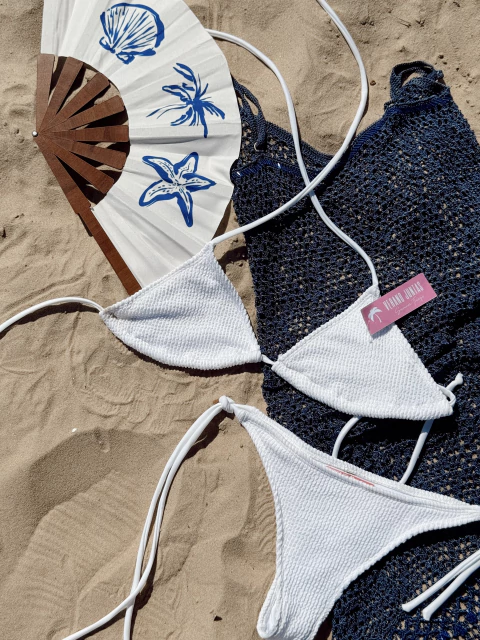 Bikini triangulito TEXTURADO, forrado y con abertura para tacitas desmontables. Bombacha colaless para atar, forrada. Talles REALES, elegí el que generalmente usas con seguridad porque te va a ir bien.